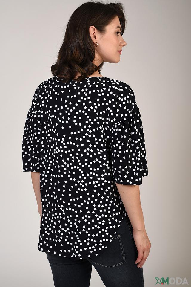 Блуза имеет классический чёрный цвет с мелким белым горошком, который придаёт ей игривый и женственный вид. Свободный крой не сковывает движения, а короткие рукава делают её идеальной для тёплой погоды.