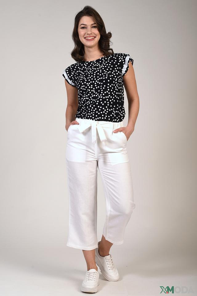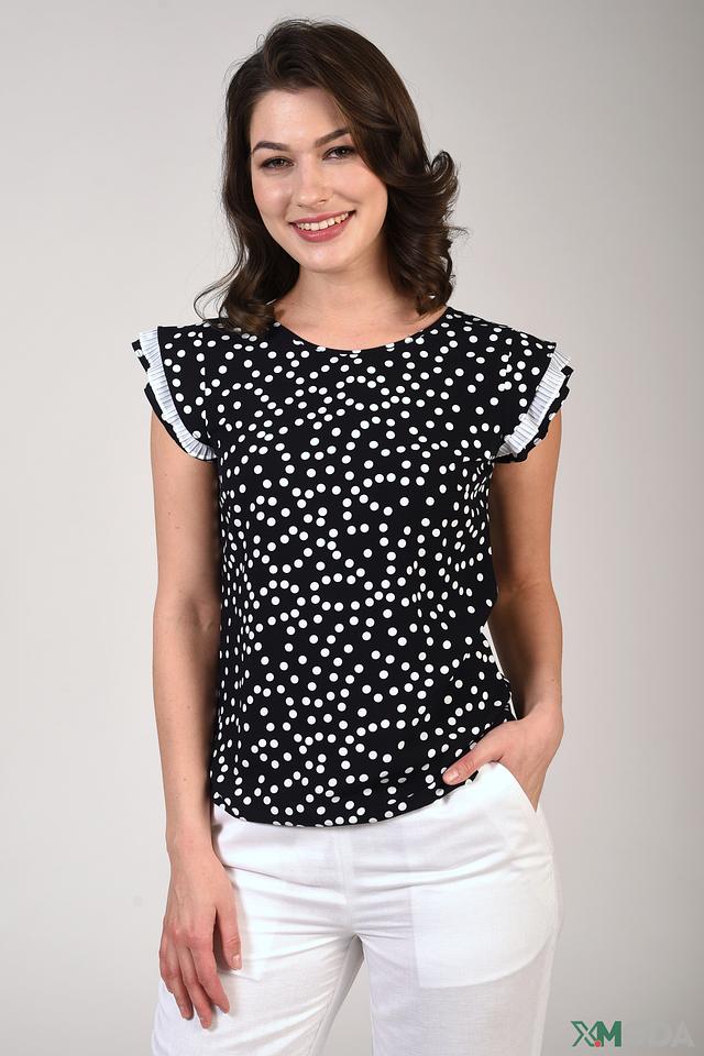 Основной цвет блузы – чёрный, а её поверхность покрыта классическим белым горошком. Воланы на рукавах придают модели романтичный и игривый вид. Круглый вырез горловины делает блузу универсальной и подходящей для различных типов фигуры.