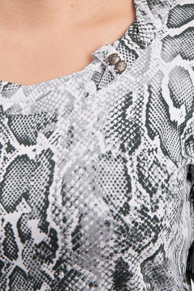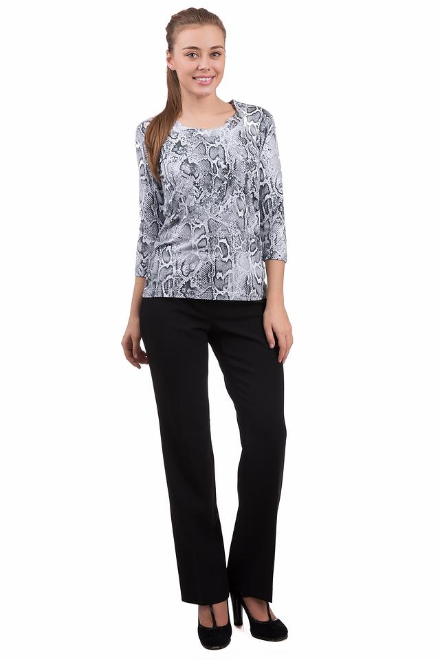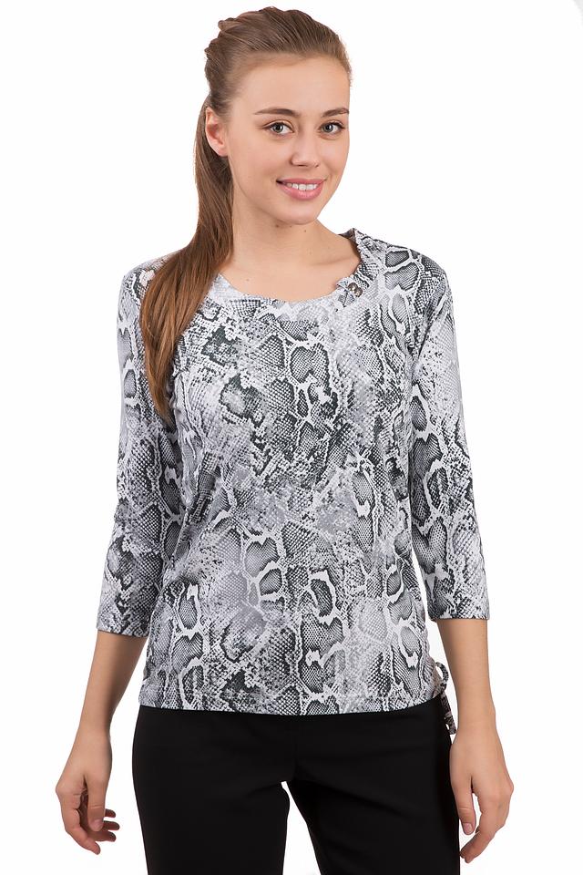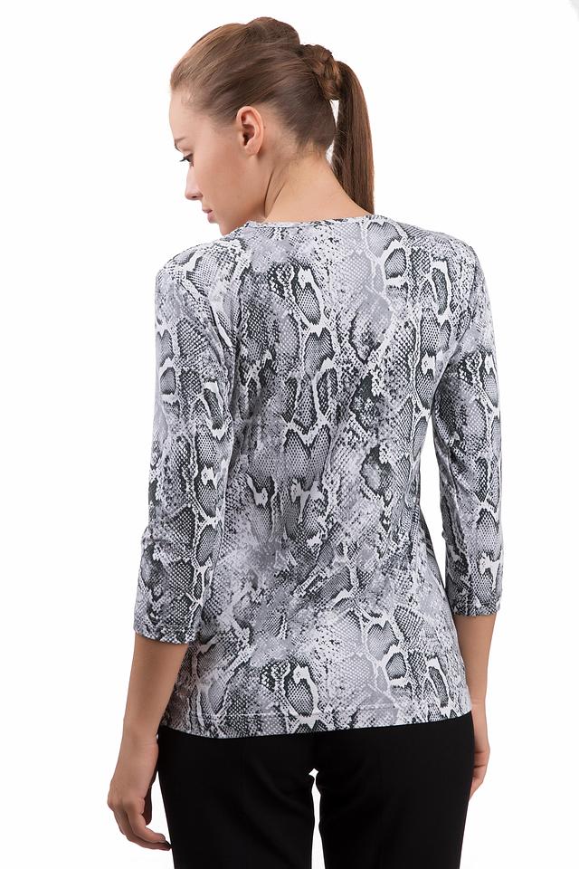 Основной цвет блузы – серый, но её главным украшением является эффектный принт, имитирующий кожу рептилии. Такой рисунок добавит вашему образу оригинальности и динамики. Блуза имеет округлый вырез горловины и короткие рукава 3/4, что делает её универсальной для разных случаев.