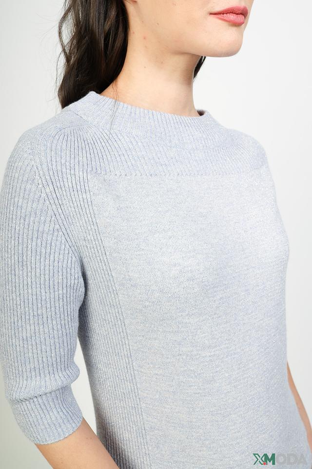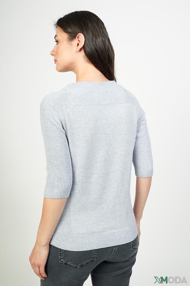 Пуловер имеет рукав три четверти, что делает его идеальным для теплой погоды или для ношения в помещении. Текстура изделия сочетает в себе гладкую лицевую сторону и вязку в рубчик на рукавах и горловине, что придает ему особый шарм.