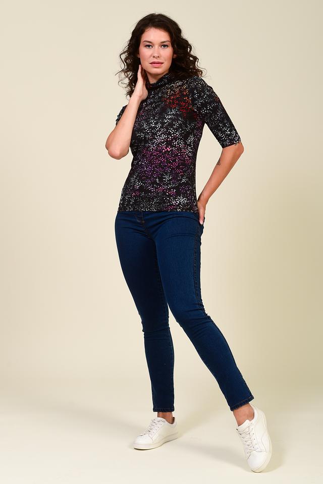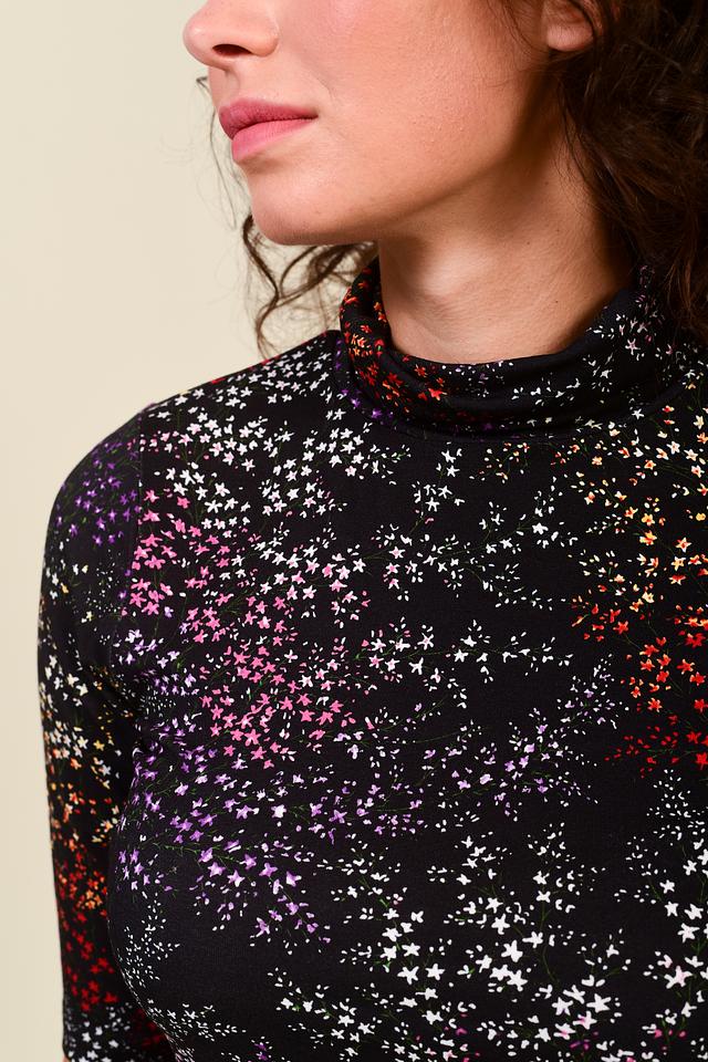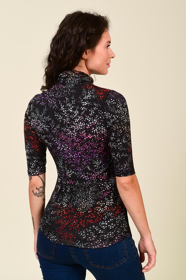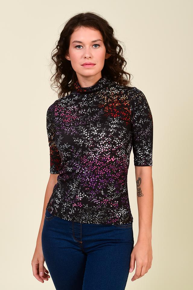 Эта женская водолазка от бренда Pezzo выполнена в чёрном цвете и украшена ярким цветочным принтом, состоящим из мелких розовых, красных, белых и фиолетовых цветов. Модель имеет облегающий силуэт и короткие рукава, что делает её идеальным выбором для создания повседневных образов.