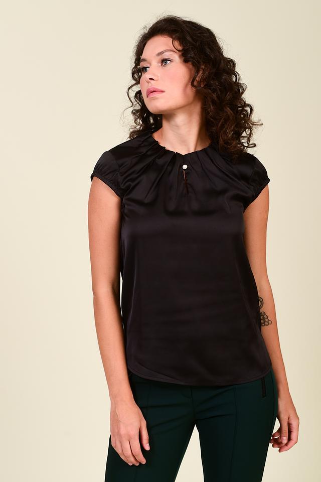 Черная блуза Pezzo из шелковистого полиэстера с короткими рукавами и изящной жемчужной застежкой. Модель имеет сборку по горловине и рукавам, что придает ей женственный и элегантный вид. Состав: полиэстер 97%, эластан 3%
