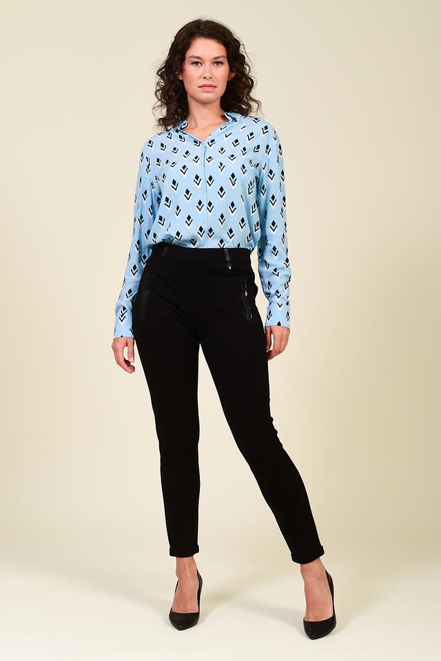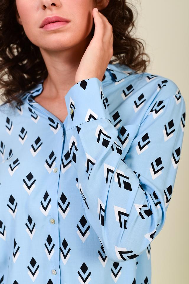 Эта блуза от Pezzo – идеальный выбор для создания элегантного и современного образа. Выполнена в нежном голубом цвете и украшена стильным геометрическим принтом чёрного цвета, который добавляет динамики и выразительности.