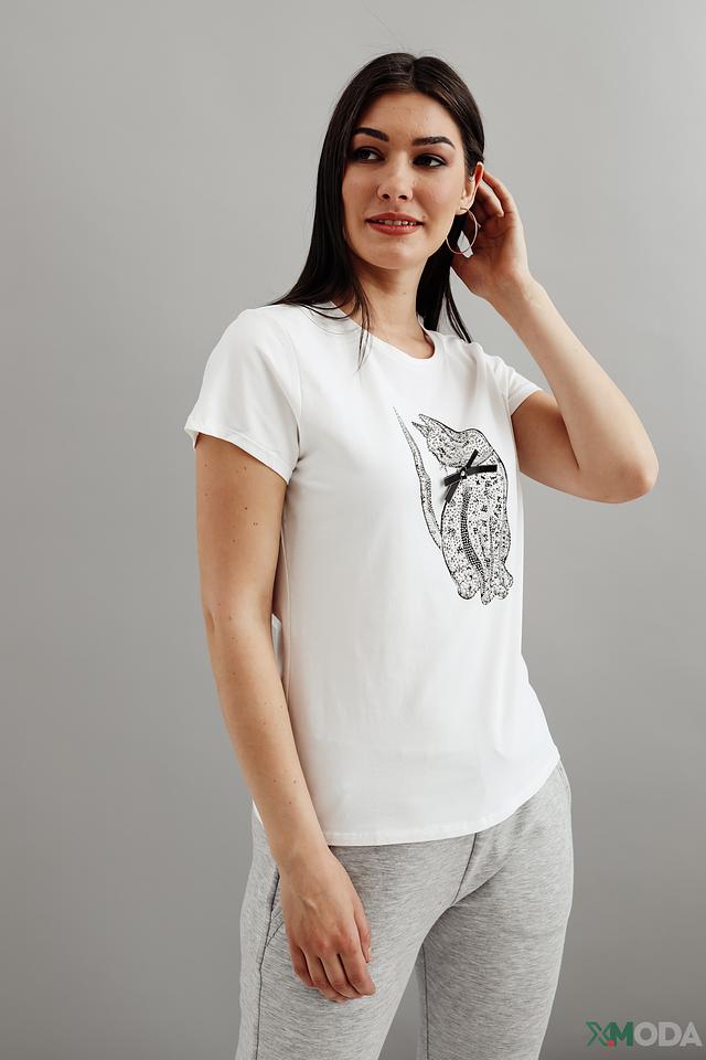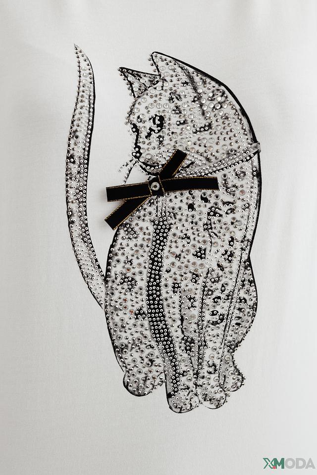 Основной цвет футболки – белый, что делает ее универсальным элементом гардероба, легко сочетающимся с различными вещами. Главная особенность модели – эффектный принт с изображением котика, выполненный с использованием страз, которые придают изделию блеск и изысканность.