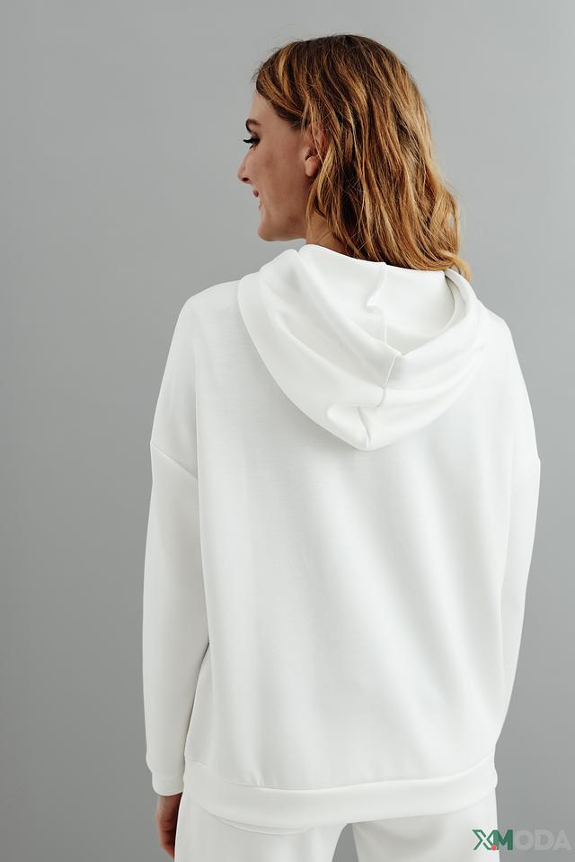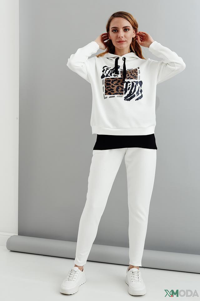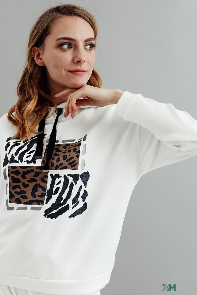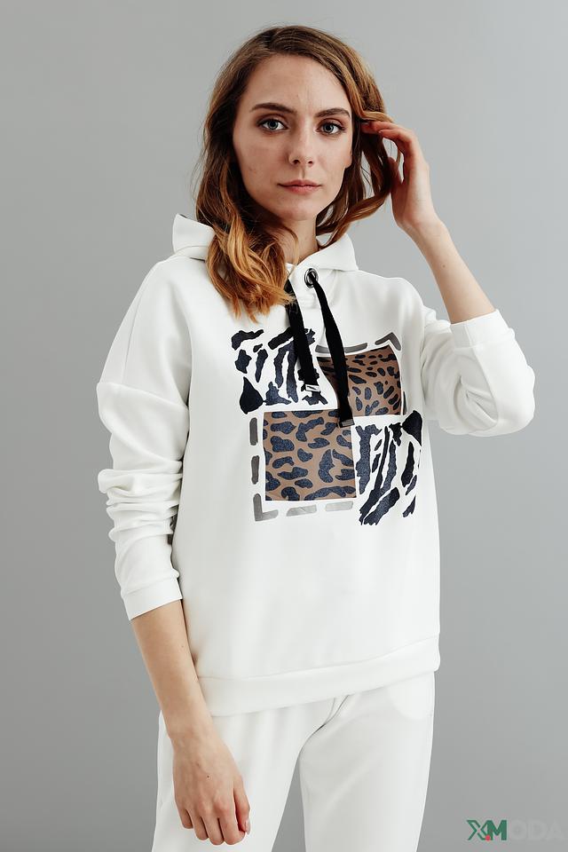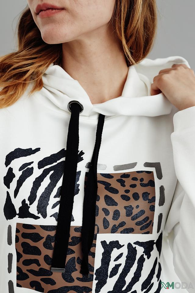 Белый пуловер Pezzo с оригинальным принтом в виде сочетания различных анималистических рисунков. Модель с капюшоном и удобным кроем станет отличным дополнением к вашему образу. Состав: полиэстер 49%, вискоза 46%, эластан 5%