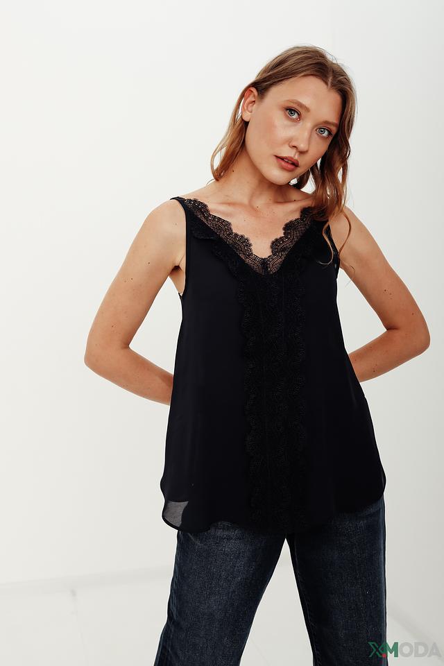Особенностью данного топа является изысканный кружевной декор в области горловины и лифа, придающий ему женственность и элегантность. Тонкие бретели и свободный крой делают этот топ идеальным выбором для тёплой погоды.