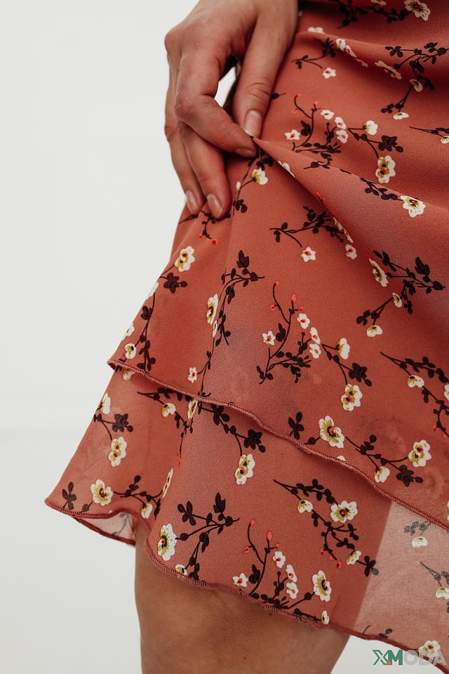 Юбка имеет приятный терракотовый цвет, украшенный мелким цветочным принтом, что придает ей романтичное настроение. Многослойный дизайн юбки создает дополнительный объем и динамику.
