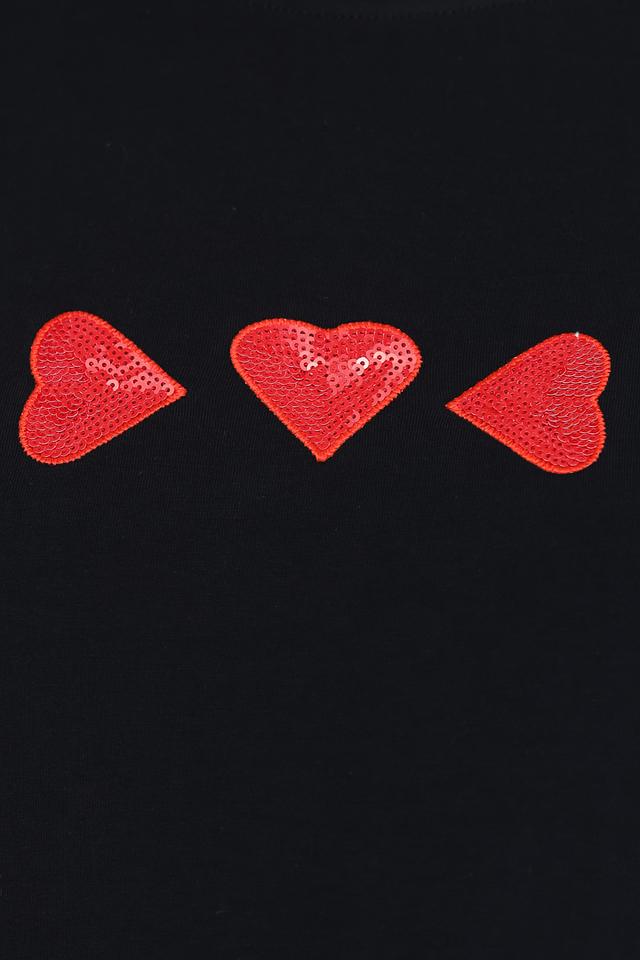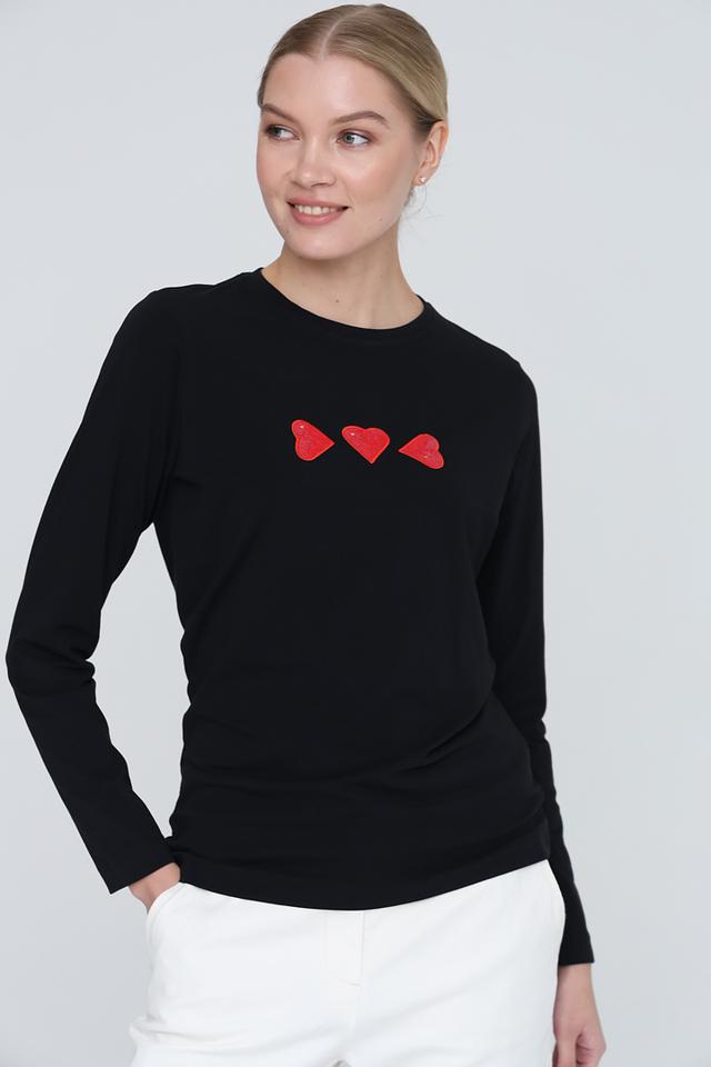 Модель имеет классический крой с длинными рукавами и круглым вырезом горловины. Особый акцент в этой модели – три декоративных сердца насыщенного красного цвета, расположенные на груди. Они придают образу игривость и романтичность.