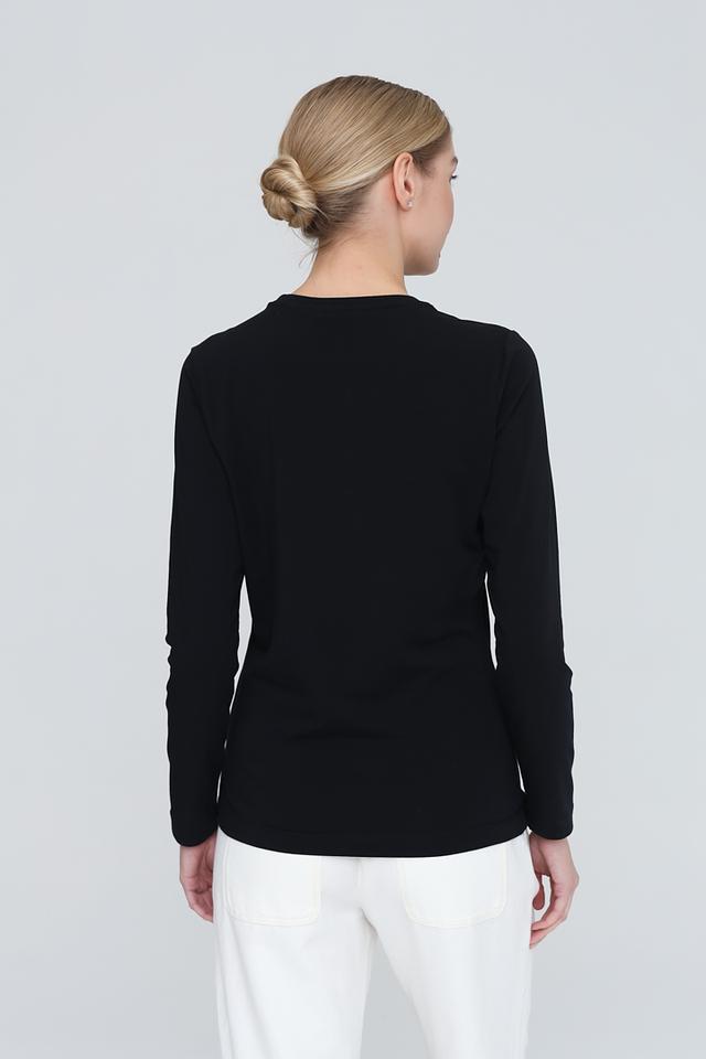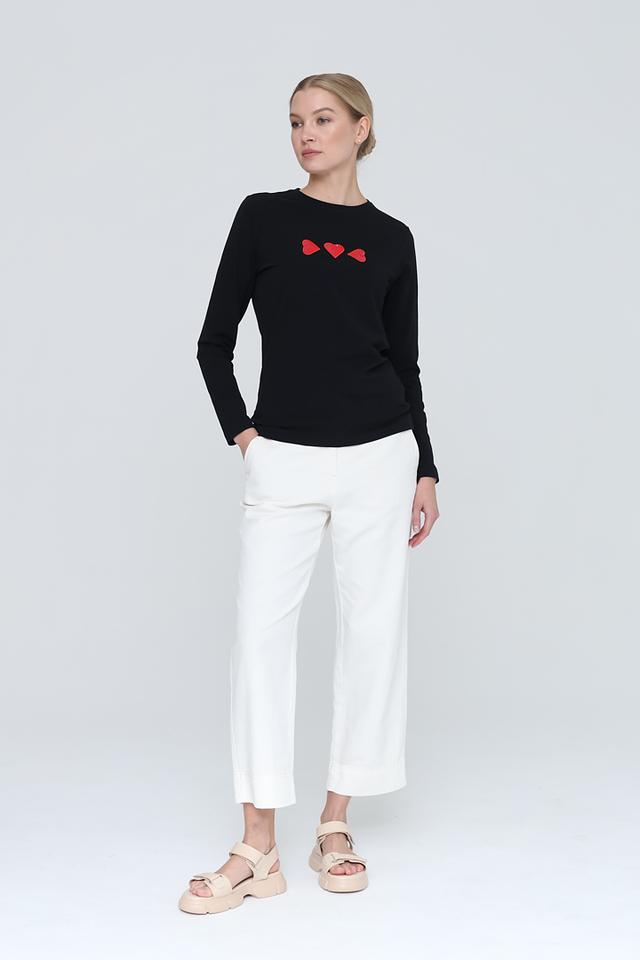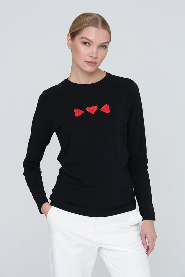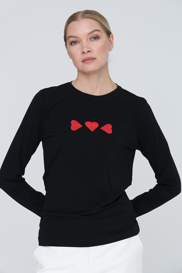 Чёрный лонгслив Pezzo с декоративными красными сердцами – стильная и комфортная базовая вещь. Изготовлен из мягкого хлопка с добавлением эластана для лучшей посадки и удобства в носке. Состав: хлопок 95%, эластан 5%