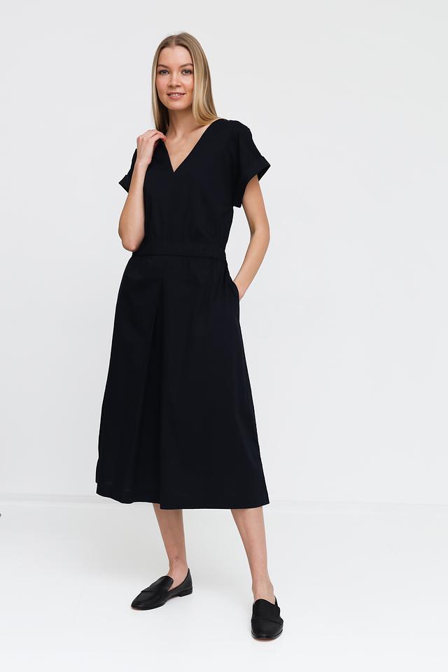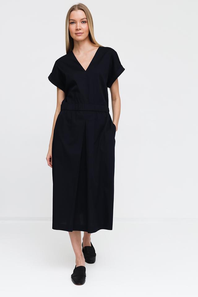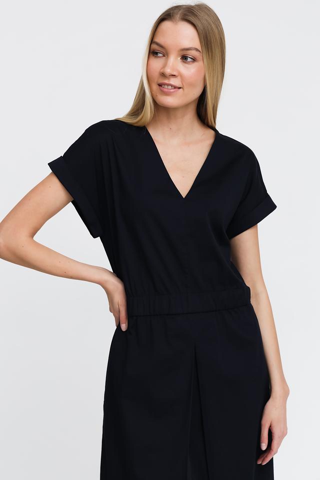 Чёрное платье от Pezzo выполнено из хлопка с добавлением эластана, имеет V-образный вырез и короткие рукава. Модель дополнена кулиской на талии, позволяющей регулировать силуэт. Состав: хлопок 95%, эластан 5%