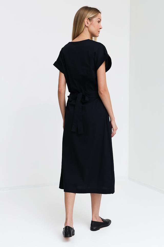 Платье оснащено кулиской на талии, которая позволяет регулировать силуэт и подчеркнуть достоинства фигуры. Боковые карманы добавляют практичности. Длина миди делает это платье универсальным вариантом для различных случаев.