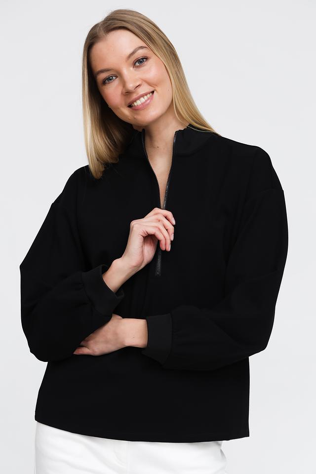 Чёрный пуловер Pezzo с молнией – стильная и комфортная модель на каждый день. Изготовлен из мягкой вискозы с добавлением нейлона и эластана, обеспечивающих приятные тактильные ощущения и хорошую посадку по фигуре. Состав: вискоза 68%, нейлон 27%, эластан 5%