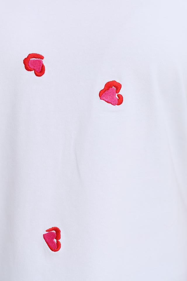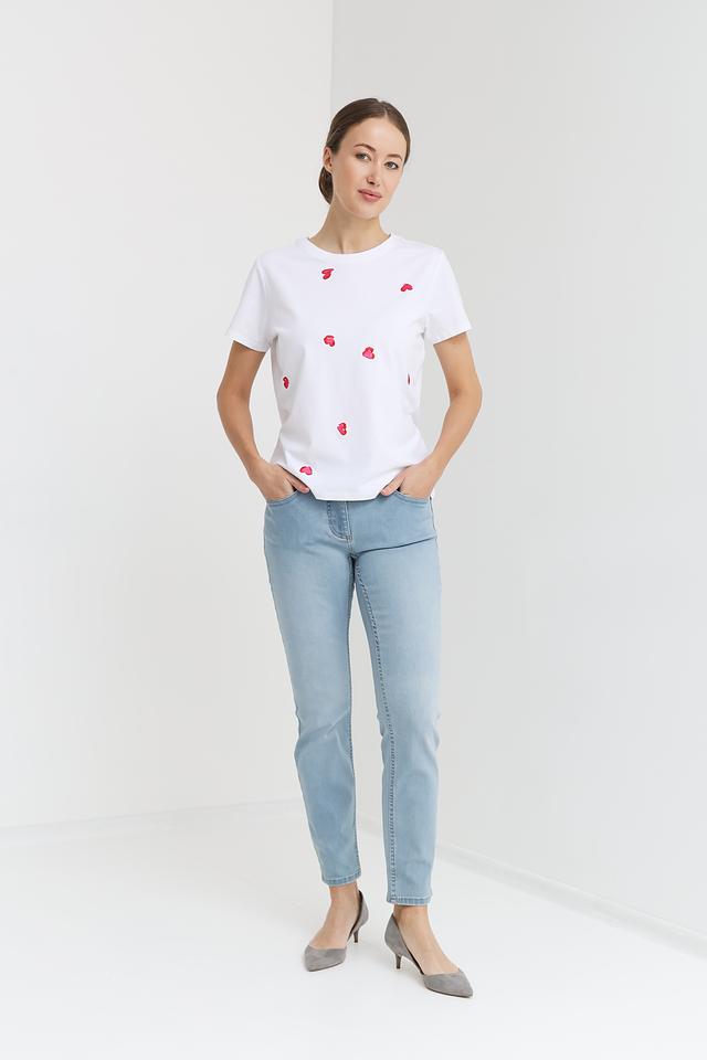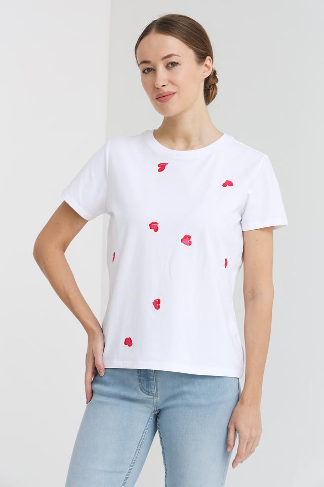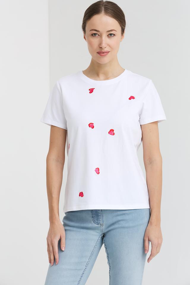 Особенностью данной модели является яркий принт в виде розовых сердечек, который добавляет игривости и женственности образу. Футболка имеет классический прямой крой и круглый вырез горловины.