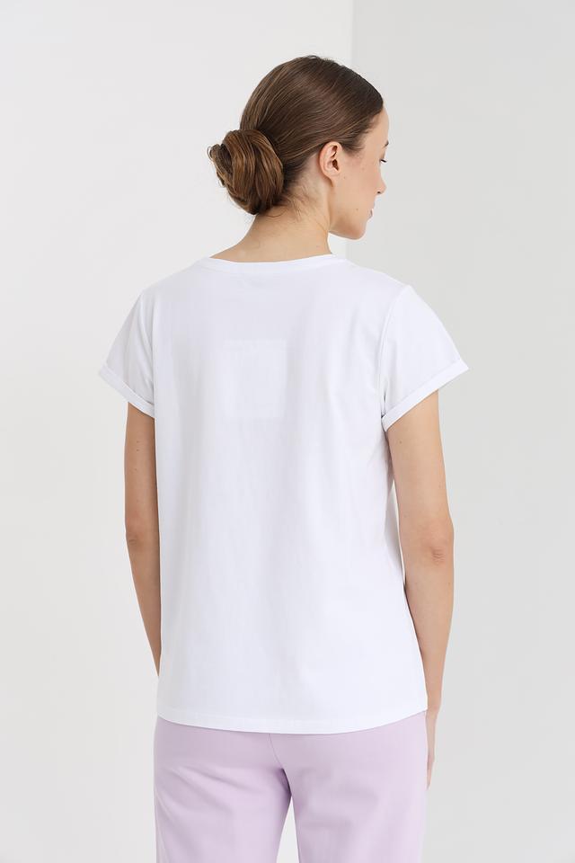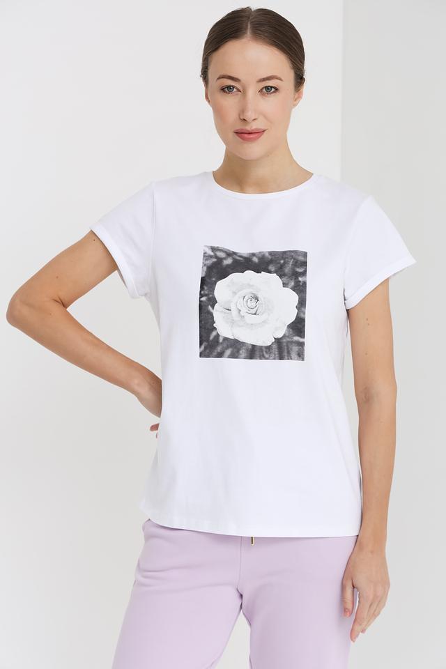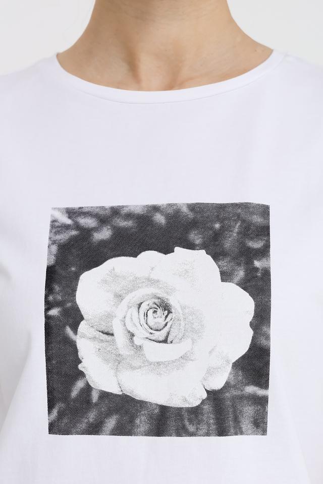Основной цвет футболки – белый, который служит идеальным фоном для эффектного принта в виде розы. Принт выполнен в черно-белой гамме, что добавляет изображению графичности и выразительности.