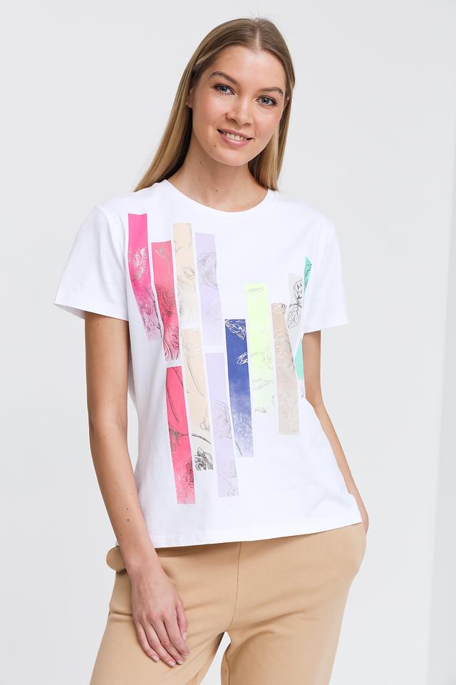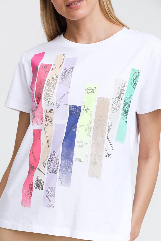 Белая футболка Pezzo с ярким цветочным принтом в виде вертикальных полос. Изготовлена из 100% хлопка, обеспечивающего комфорт и воздухопроницаемость. Стильный и оригинальный выбор для повседневного образа. Состав: хлопок 100%