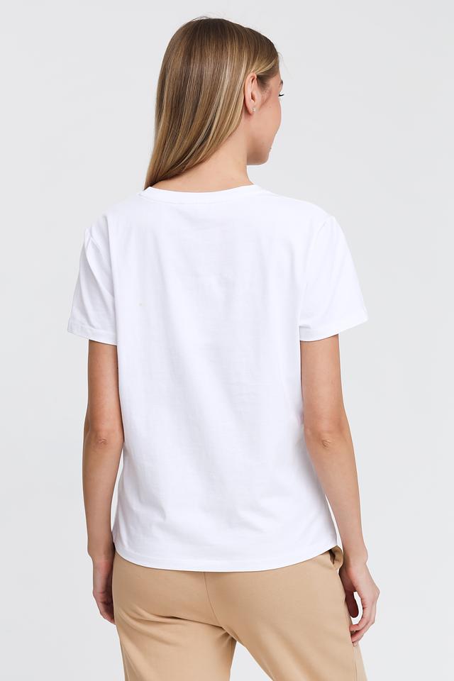 Футболка имеет классический прямой крой и круглый вырез горловины. Она идеально подходит для создания повседневных образов, сочетаясь с джинсами, шортами или юбками. Благодаря своему стильному дизайну, эта футболка станет ярким акцентом в вашем образе.