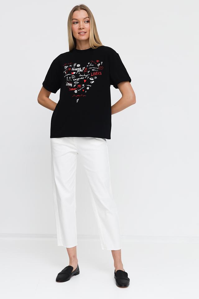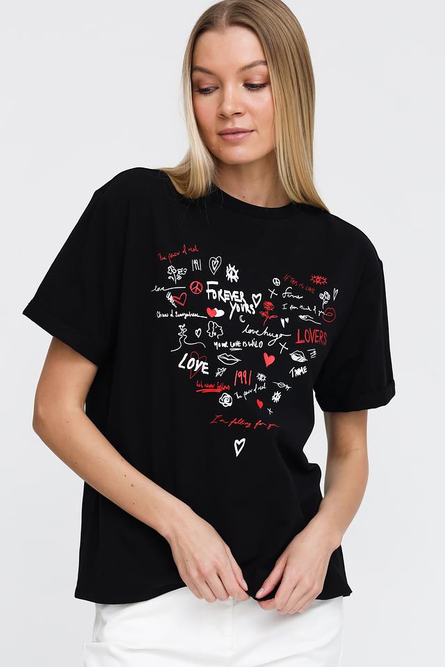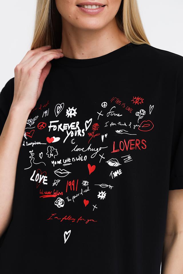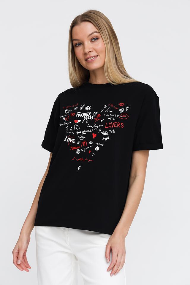Эта футболка от Pezzo станет ярким акцентом в вашем гардеробе. Выполнена в классическом чёрном цвете, украшена эффектным принтом с надписями и изображениями сердец, губ и других романтичных символов.