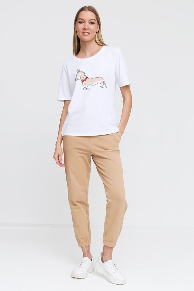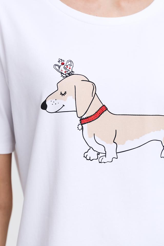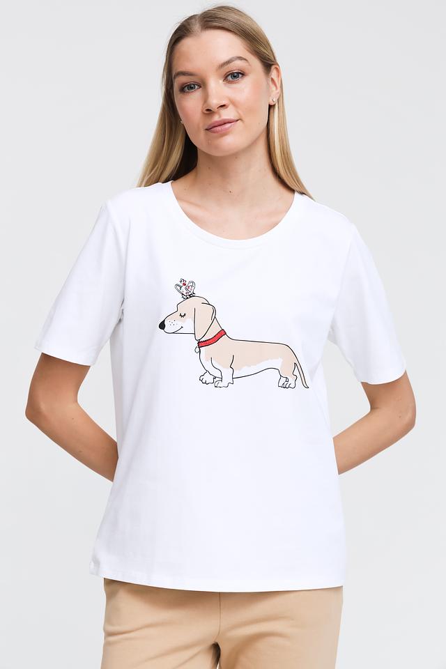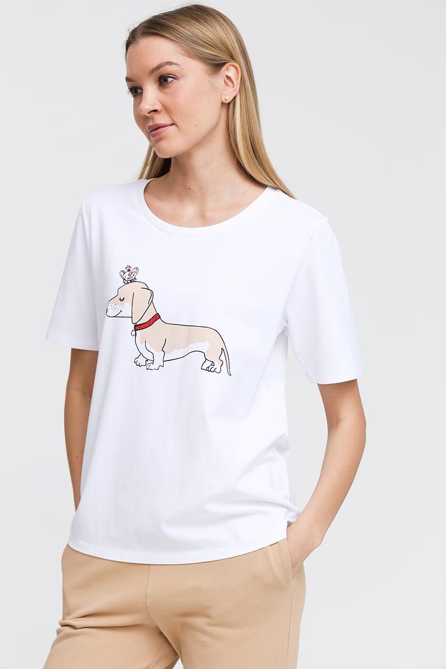 Основным акцентом футболки является яркий и забавный принт с изображением собаки дачшхунд. Принт выполнен в графическом стиле и добавляет изделию индивидуальности.