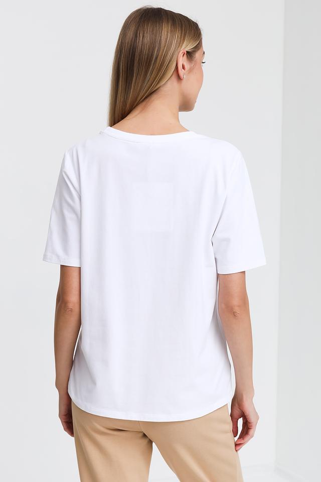 Футболка имеет классический прямой крой, круглый вырез горловины и короткие рукава. Она прекрасно сочетается с джинсами, шортами, юбками и другими элементами гардероба. Эта модель станет отличным выбором для тех, кто ценит комфорт, стиль и оригинальность.
