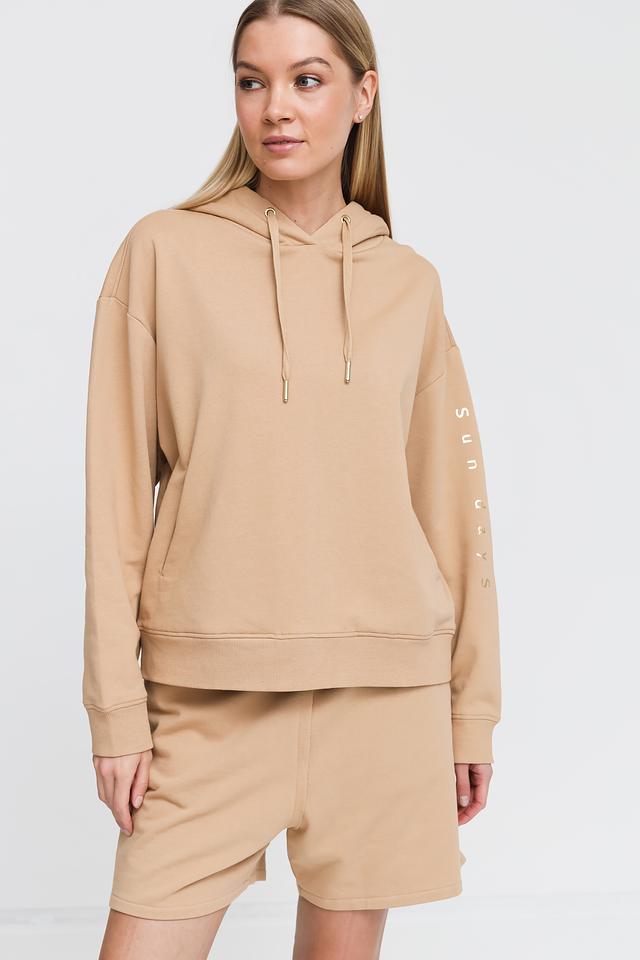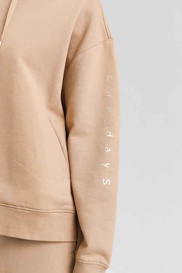 Эта женская толстовка от бренда Pezzo выполнена в приятном бежевом цвете и станет отличным дополнением к вашему гардеробу. Модель имеет свободный крой, капюшон со шнурками и кенгуру-карман. На рукавах и груди присутствует надпись "Sundays", добавляющая образу оригинальности.
