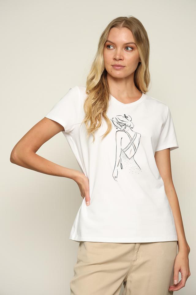 Особенностью данной модели является стильный принт с изображением женского силуэта, выполненный в графичном стиле. Футболка имеет прямой крой и короткие рукава, что делает ее универсальной для различных образов.