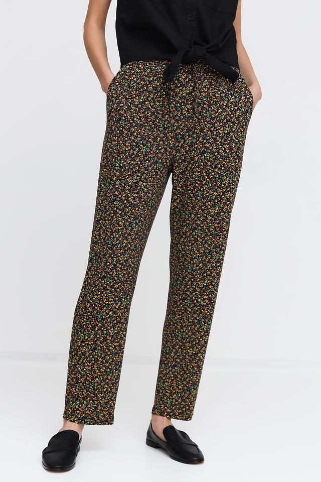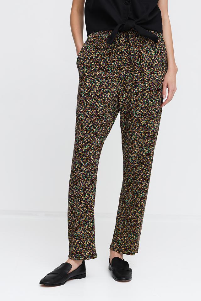 Брюки имеют классический крой с завышенной талией и прямыми штанинами. Пояс дополнен эластичной резинкой и завязками, что позволяет регулировать посадку по фигуре. На брюках расположен яркий цветочный принт, который добавляет образу женственности и оригинальности.