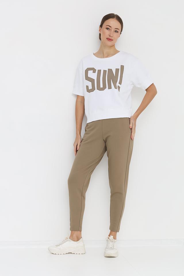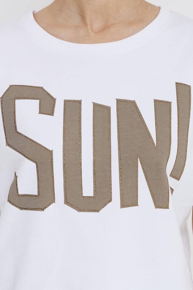 Этот стильный пуловер от Pezzo выполнен в белом цвете и украшен крупной надписью "SUN!" бежевого оттенка. Надпись выполнена в виде аппликации с декоративной строчкой по контуру, что придает изделию особый шарм.