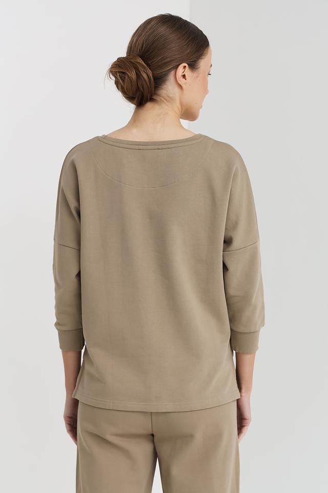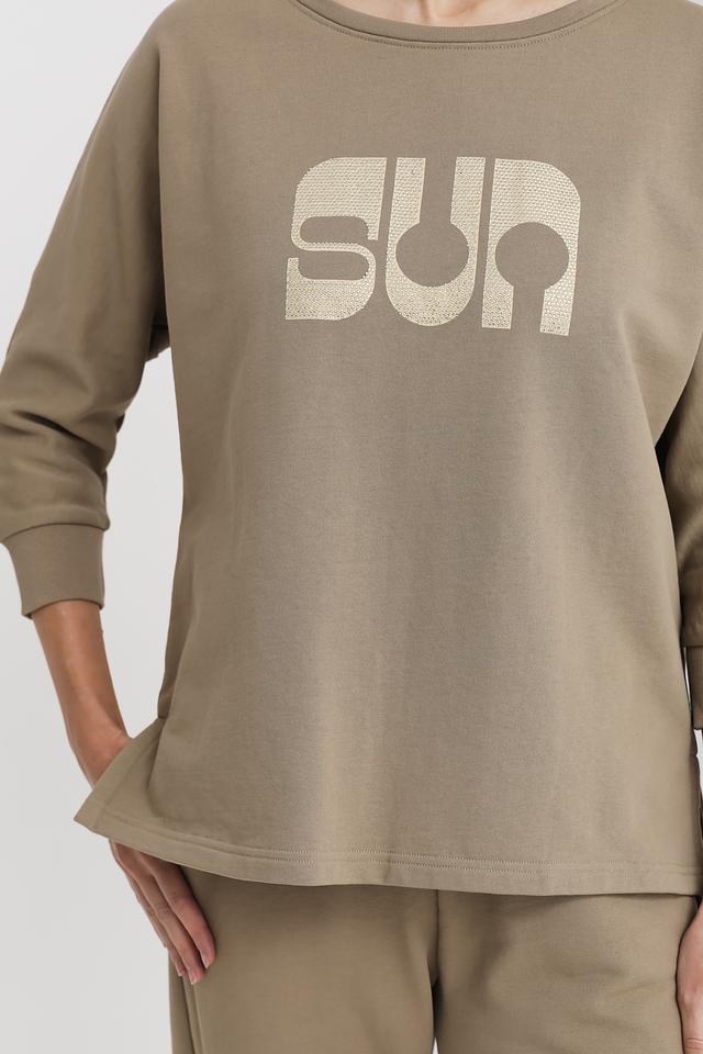 Женская толстовка Pezzo цвета хаки с надписью "SUN" — удобная и стильная модель из хлопка с добавлением полиэстера. Свободный крой и рукав 3/4 делают ее отличным выбором для повседневной носки. Состав: хлопок 75%, полиэстер 25%