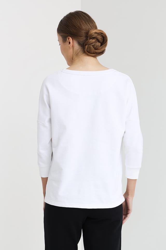 Толстовка имеет свободный крой, что обеспечивает максимальный комфорт при носке. Рукава 3/4 делают ее идеальным вариантом для теплой погоды. Округлый вырез горловины.
