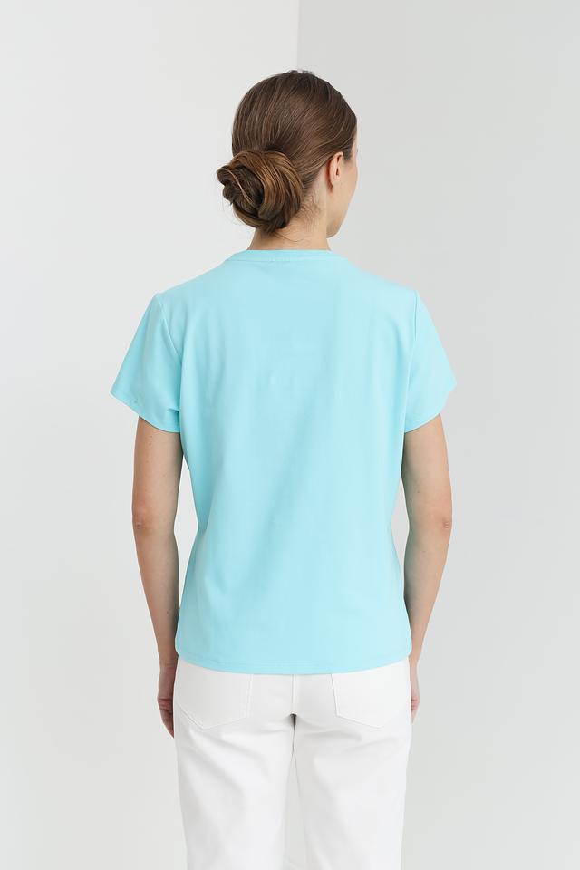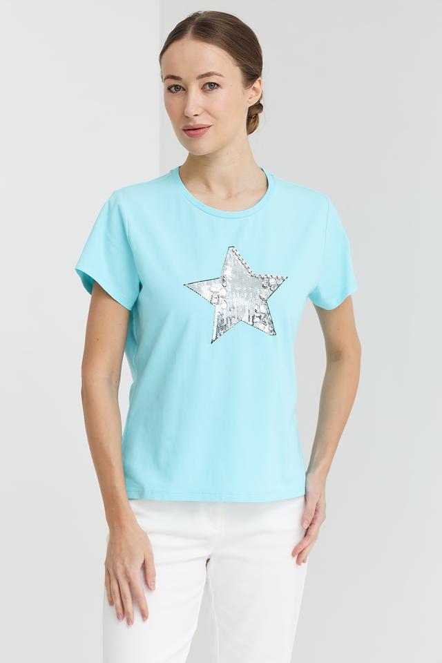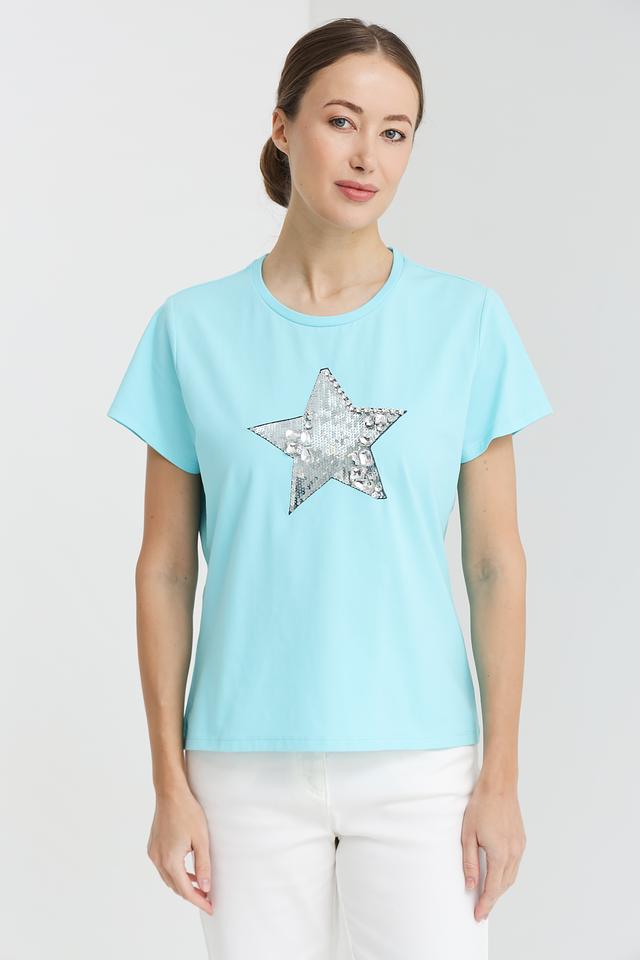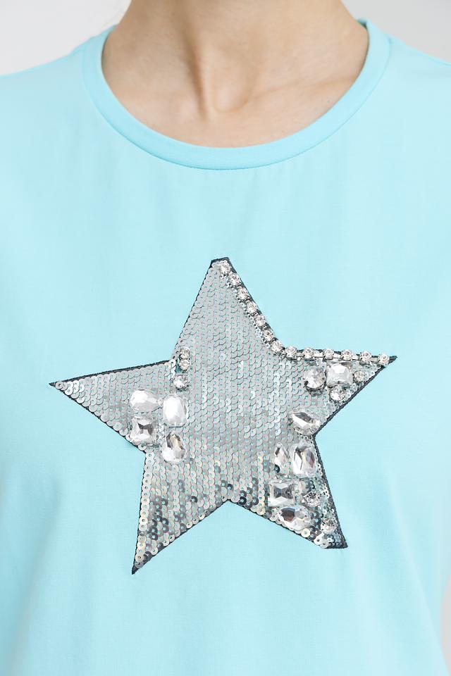 Основной цвет футболки – нежно-голубой, который прекрасно сочетается с различными оттенками. Главной особенностью модели является крупная звезда, выполненная из сверкающих пайеток. Звезда придает футболке праздничный и игривый вид.