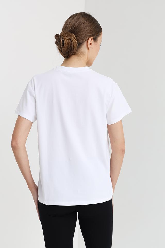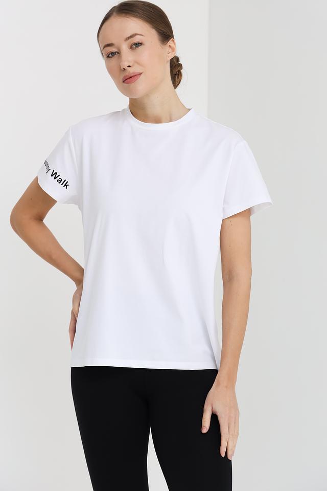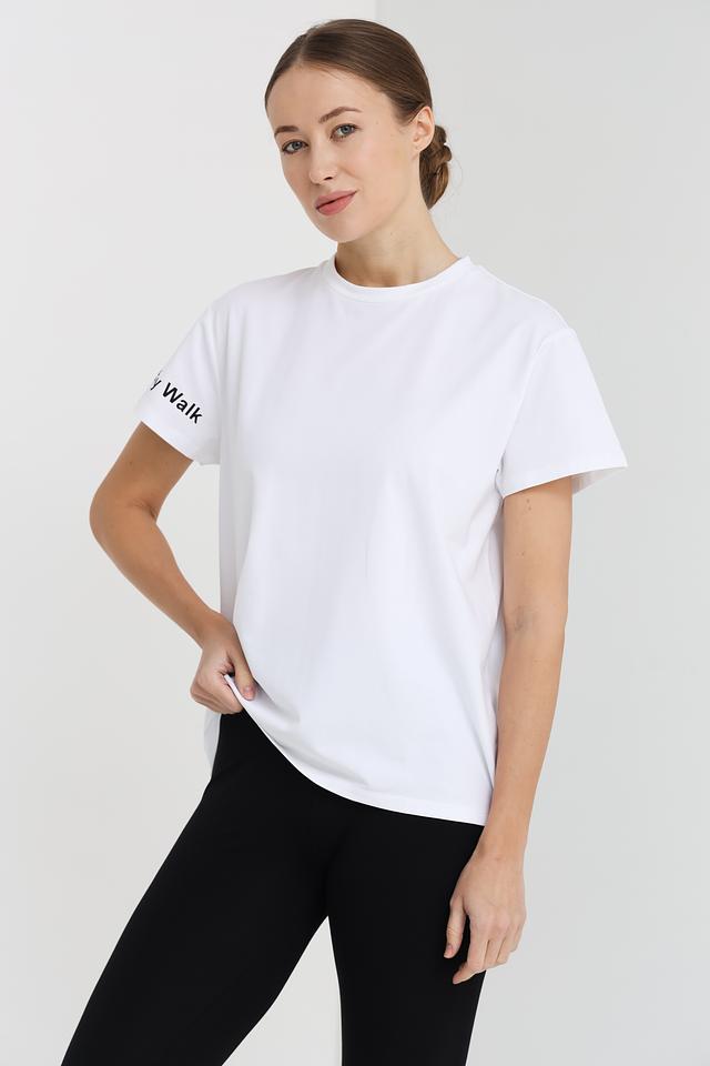 Белая футболка Pezzo свободного кроя с короткими рукавами и принтом "Sunny Walk" на рукаве. Изготовлена из мягкого хлопка с добавлением эластана для комфорта и свободы движений. Состав: хлопок 95%, эластан 5%