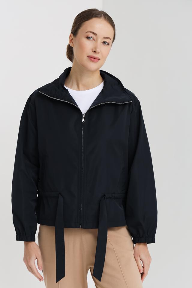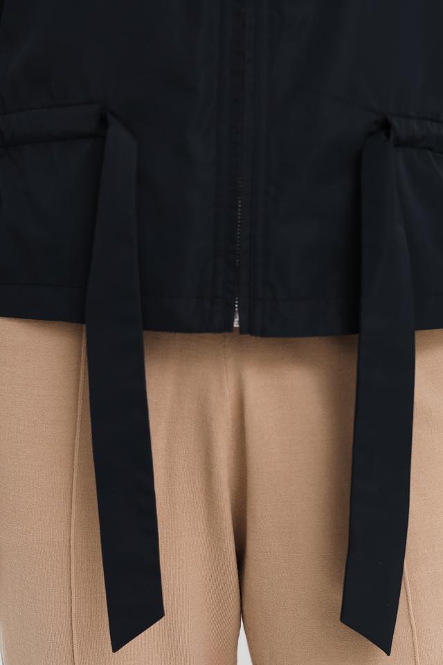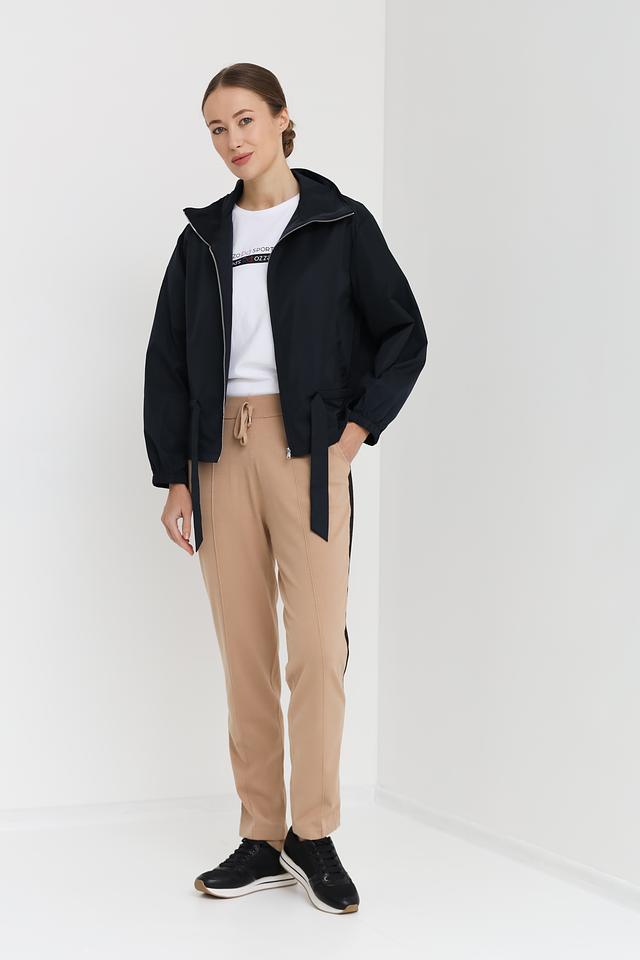 Куртка имеет прямой крой, капюшон и застёжку-молнию. Рукава объёмные, фонарики, что добавляет образу лёгкости и оригинальности. Модель дополнена поясом, который позволяет подчеркнуть талию и создать более женственный силуэт.