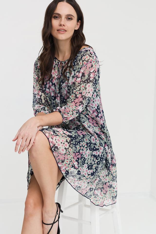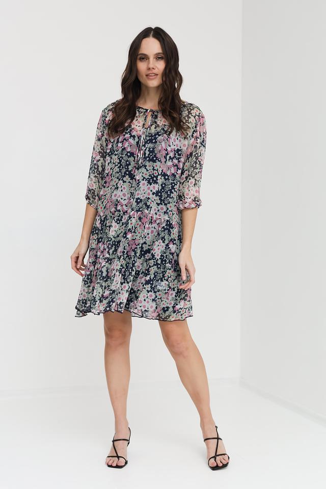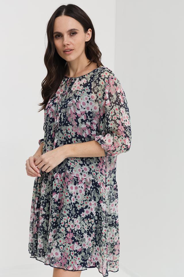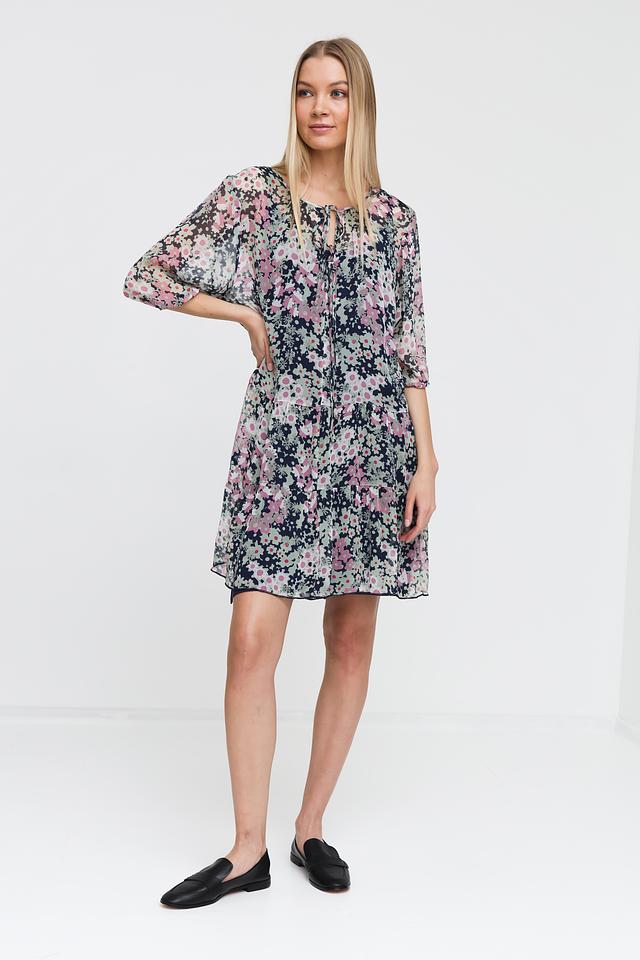 Платье имеет яркий цветочный принт на тёмно-синем фоне, что делает его особенно привлекательным. V-образный вырез горловины и рукава длиной 3/4 придают модели женственность и элегантность.
