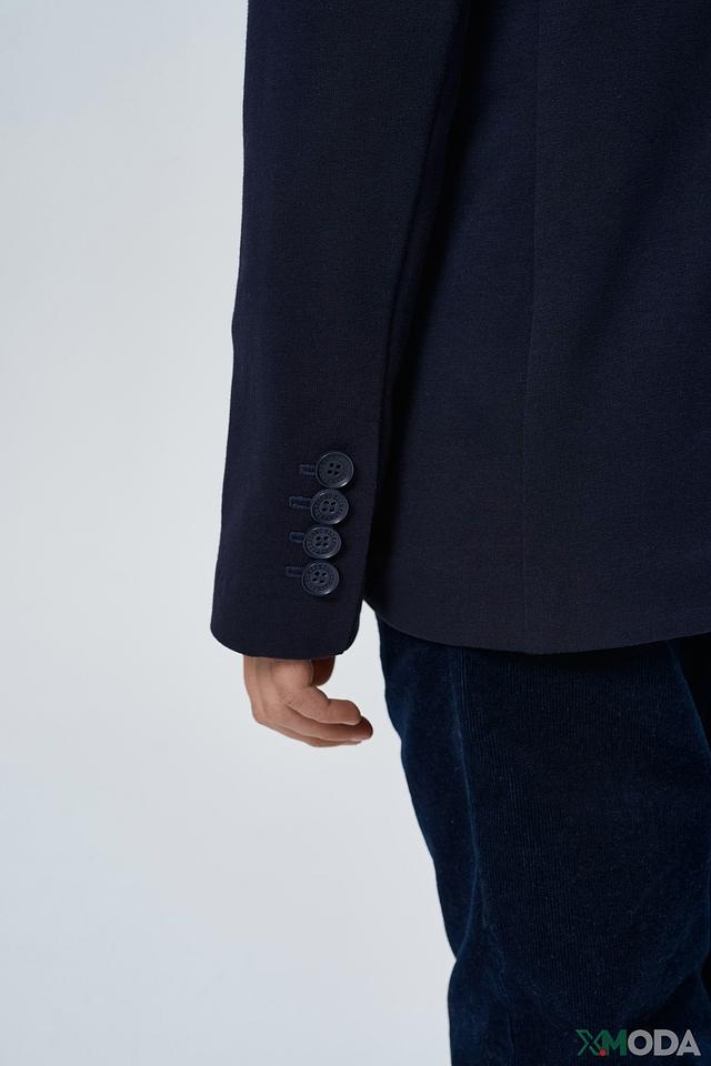 Пиджак имеет однобортную застёжку на пуговицы, лацканы стандартной ширины и два функциональных кармана с клапанами. Рукава пиджака оформлены четырьмя пуговицами. Благодаря составу, включающему 95% хлопка и 5% полиуретана, пиджак приятен к телу, хорошо держит форму и прост в уходе.