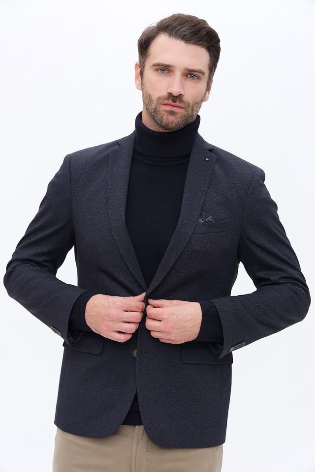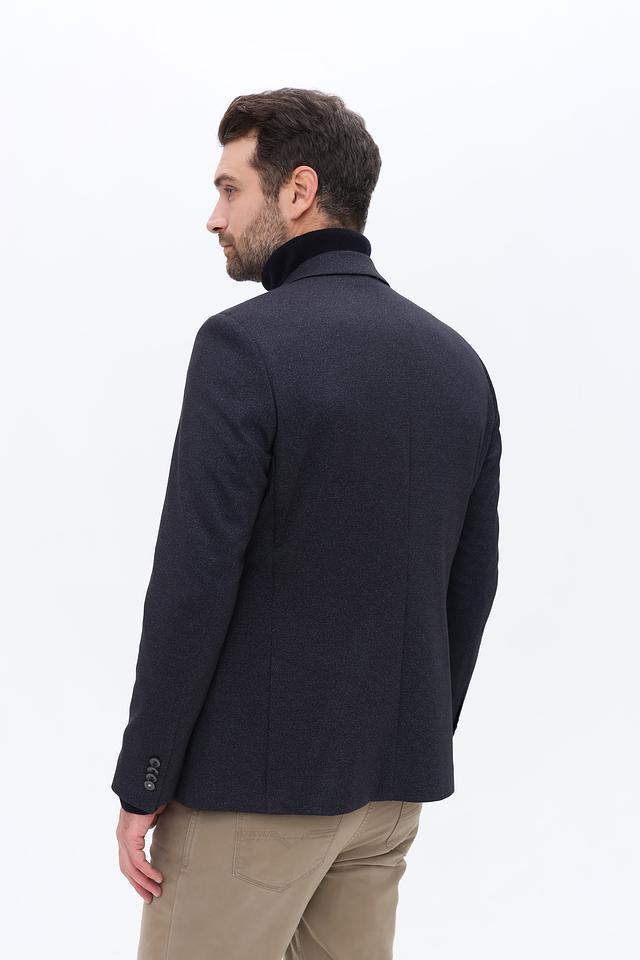 Модель застегивается на две пуговицы, имеет стандартные лацканы и два боковых кармана с клапанами. На левой стороне груди предусмотрен аккуратный нагрудный карман для платка или ручки. Пиджак выполнен из смеси полиэстера, вискозы и эластана, что обеспечивает ему приятную текстуру, хорошую посадку и устойчивость к сминанию.