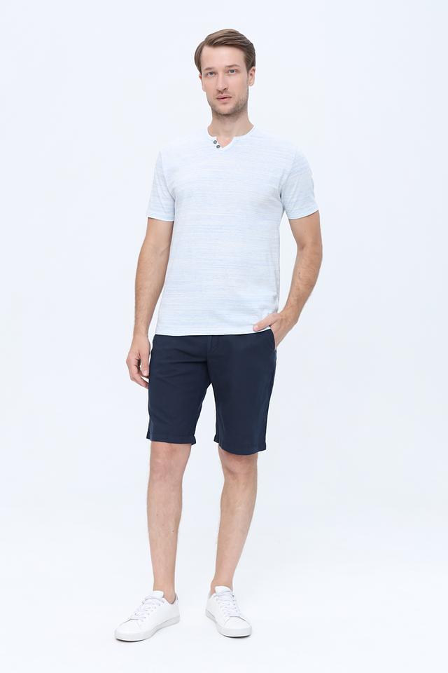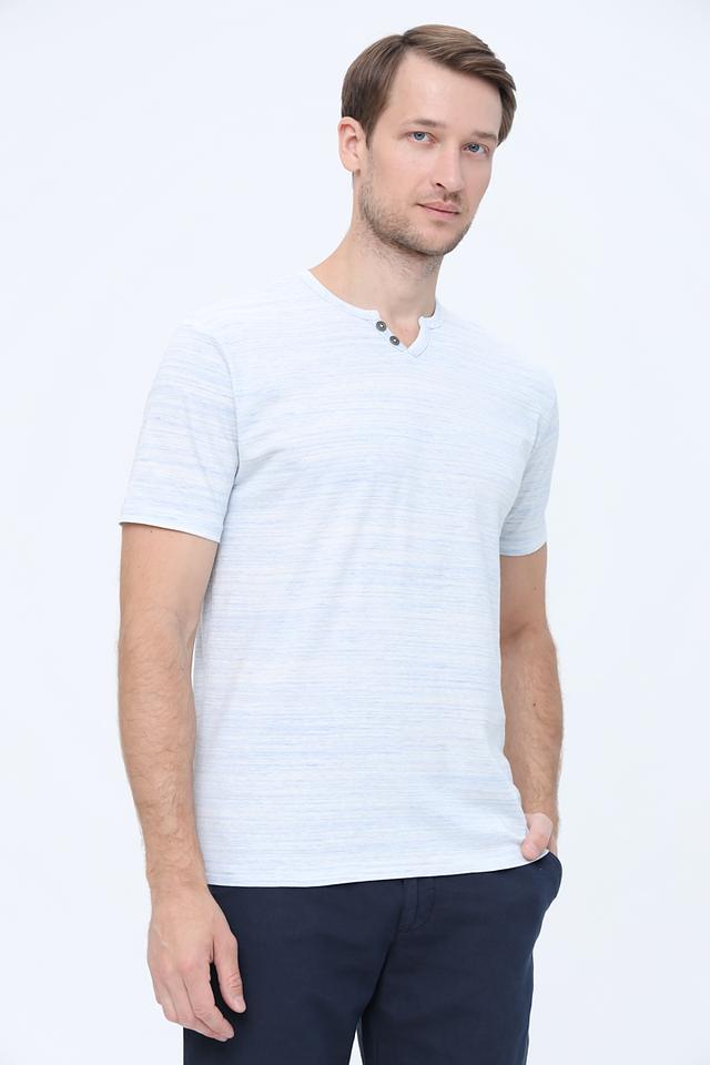 Модель имеет классический крой с короткими рукавами и V-образным вырезом, который оформлен планкой на три пуговицы. Это придает футболке более аккуратный и интересный вид, чем стандартная круглая горловина.