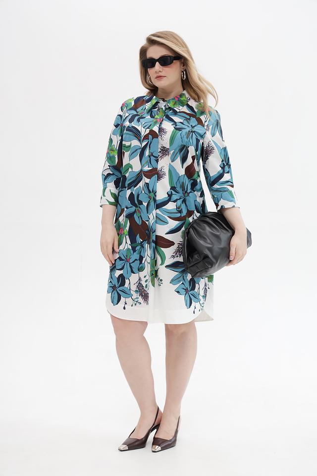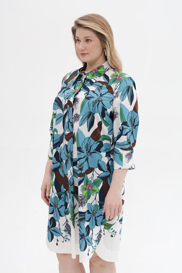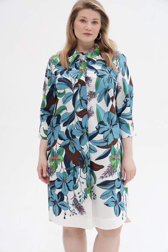 Платье имеет прямой, слегка приталенный силуэт, который подчеркнет достоинства фигуры. Рукава длиной 3/4 и классический воротник рубашка придают модели элегантный и женственный вид. Изделие выполнено из 100% хлопка – натурального, приятного к телу материала, который обеспечивает комфорт в течение всего дня.
