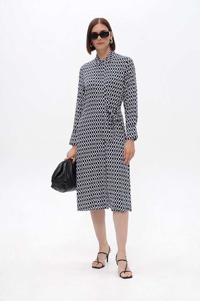 Платье имеет прямой крой, воротник-стойку и длинные рукава. Завязывающийся пояс позволяет подчеркнуть талию и создать более женственный силуэт. Модель выполнена из 100% вискозы, что обеспечивает комфорт и приятные ощущения при носке.