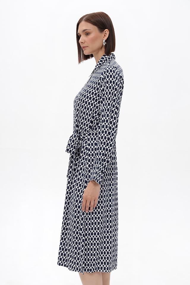 Платье Olsen синего цвета с геометрическим принтом – стильное и комфортное решение для повседневного образа. Модель выполнена из 100% вискозы, имеет воротник-стойку и завязывающийся пояс. Состав: вискоза 100%