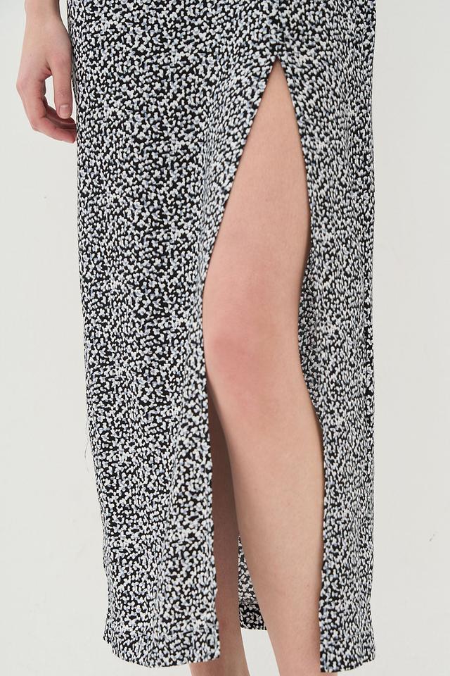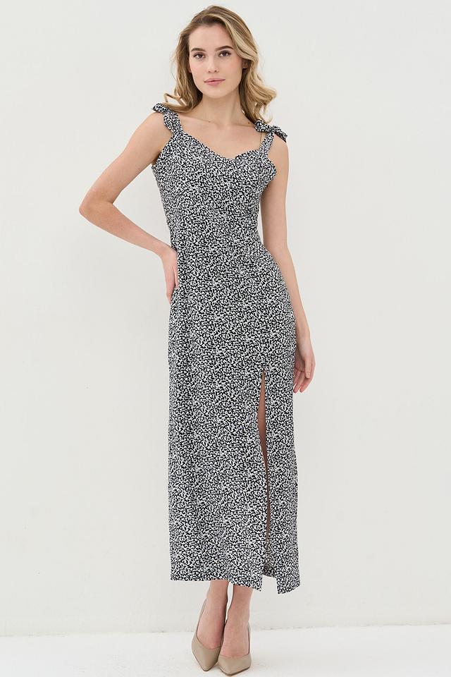 Высокий разрез сбоку придает платью пикантности и позволяет создать стильный и современный образ. Мелкий цветочный принт делает модель особенно женственной и привлекательной. Это платье идеально подойдет для прогулок, встреч с друзьями или особых случаев.