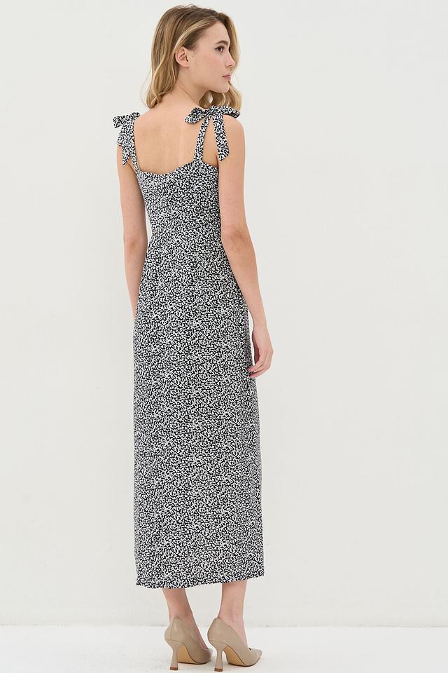 Платье имеет приталенный силуэт и длину миди, подчеркивающую фигуру. Декоративные завязки на плечах добавляют образу романтичности.