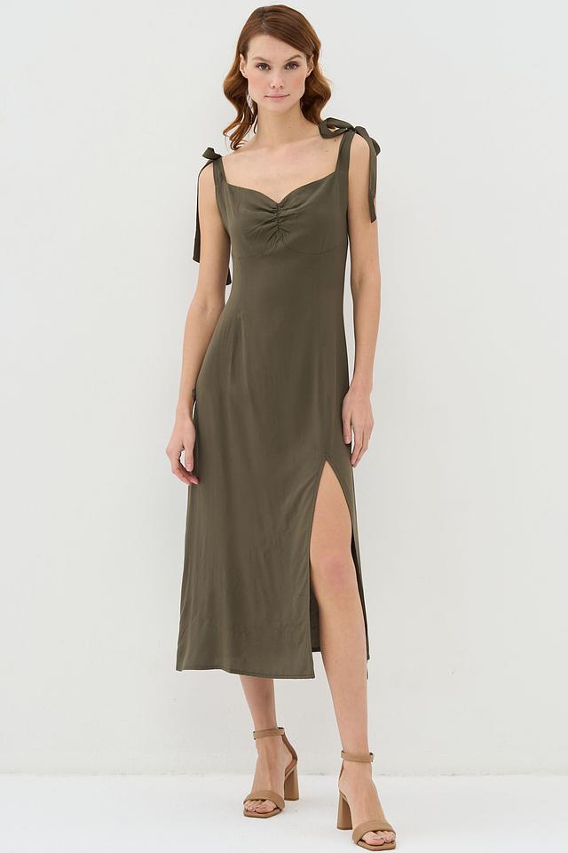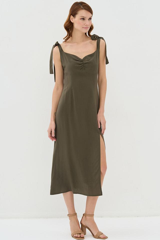Платье BE YOU оливкового цвета – это воплощение женственности и элегантности. Модель имеет прямой силуэт, длину миди и эффектный разрез сбоку, который придает образу динамичность.