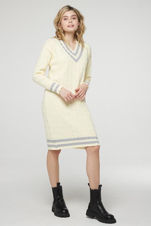 Вязаное платье BE YOU кремового цвета с контрастными полосками и V-образным вырезом. Модель выполнена из мягкого сочетания хлопка и шерсти, обеспечивающего комфорт и тепло. Идеальный выбор для создания уютного и стильного образа. Состав: пан 70%, шерсть 30%