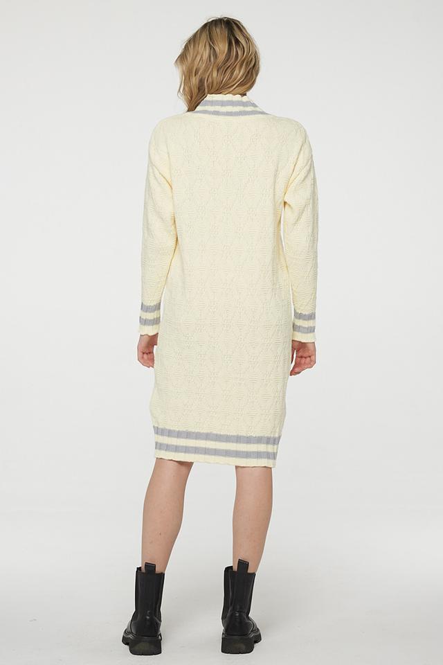 Это уютное вязаное платье от BE YOU станет отличным дополнением к вашему гардеробу. Платье выполнено в нежном кремовом цвете и украшено контрастными полосками на горловине, рукавах и подоле, что придает ему особый шарм.