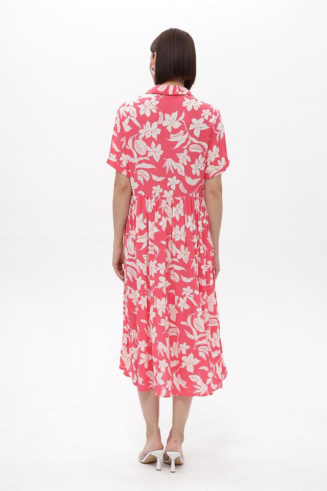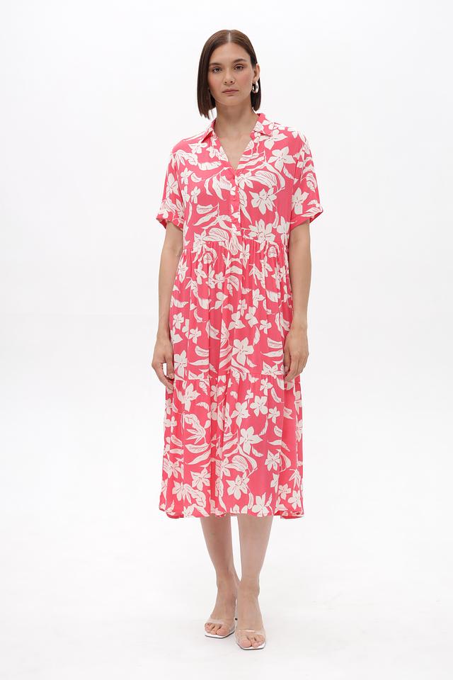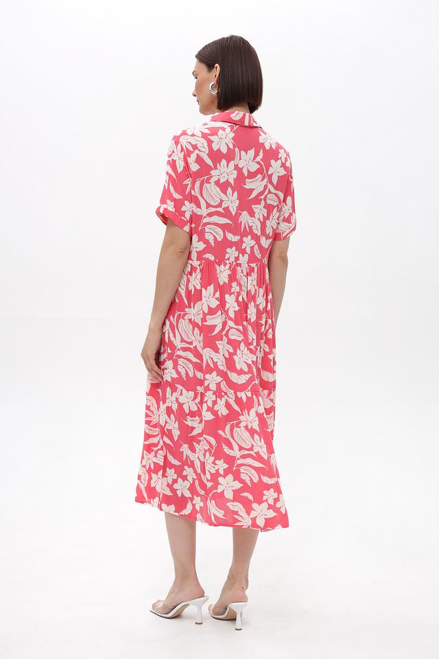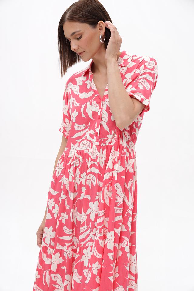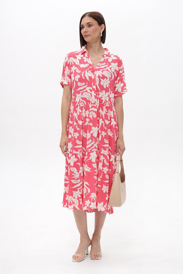 Это платье от бренда Broadway выполнено из 100% вискозы, что обеспечивает легкость и приятные ощущения на коже. Преобладающий цвет – коралловый, украшенный нежным цветочным принтом белого цвета.