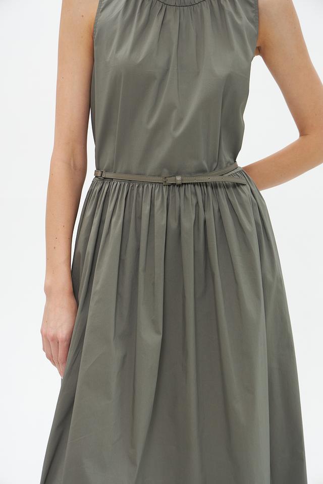 Платье имеет прямой силуэт, длину миди и лишенный рукавов крой. Вырез горловины округлый, с небольшой сборкой, что придает платью женственность. Талия подчеркнута притачным поясом, который можно завязать на бант или оставить свободно.