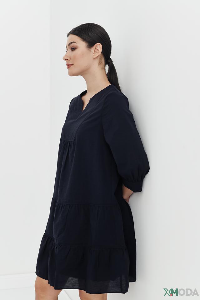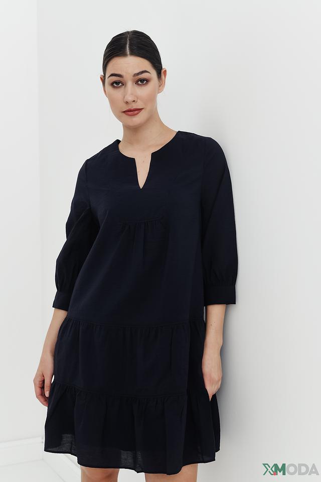 Темно-синее платье от Comma свободного кроя с рукавами 3/4 и V-образным вырезом. Платье выполнено из смесовой ткани с добавлением хлопка, что обеспечивает комфорт и воздухопроницаемость. Отличный выбор для создания повседневного образа. Состав: Состав_подкладка вискоза 100%, хлопок 73%, полиамид 27%