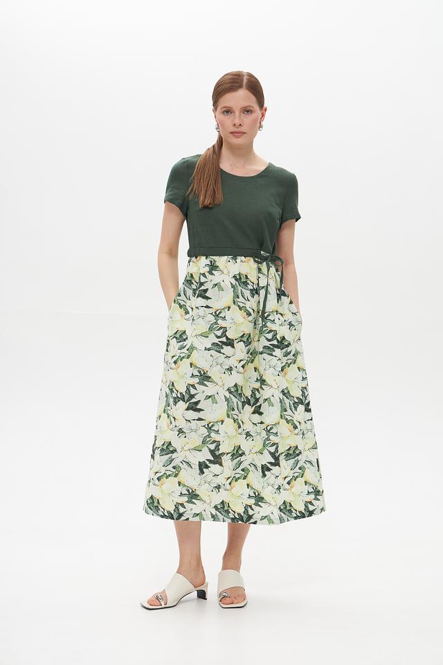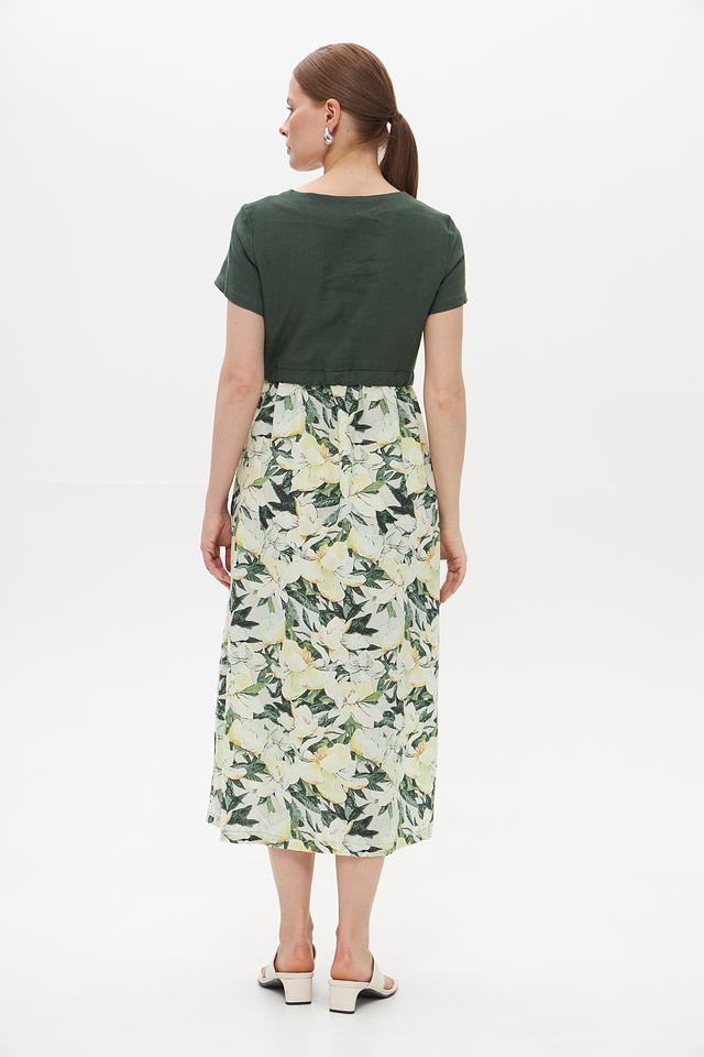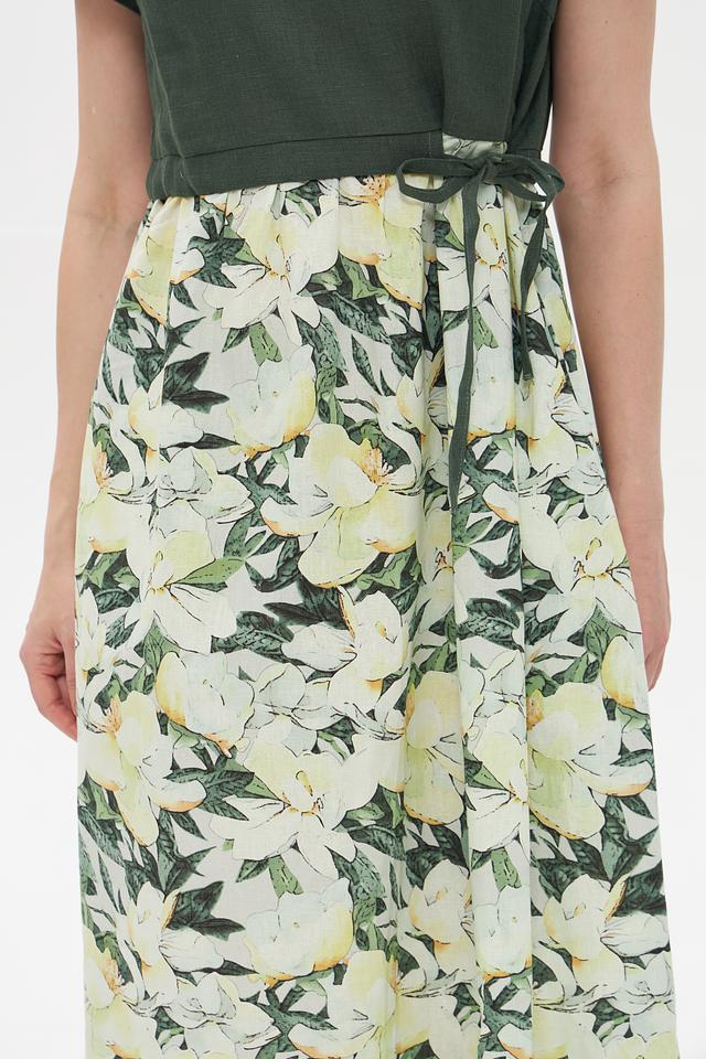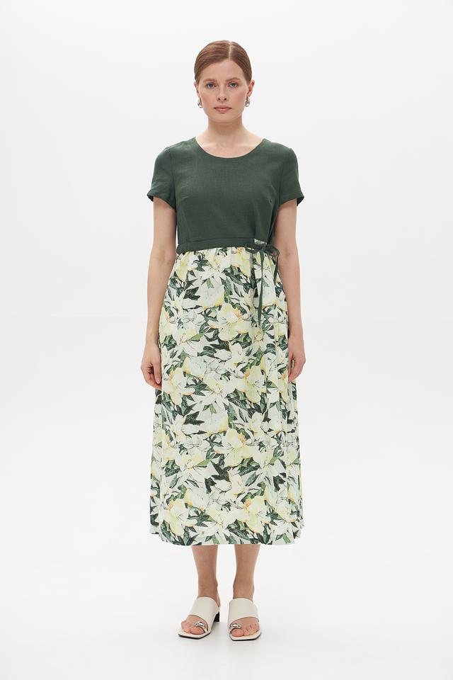 Это стильное платье от Electra style станет прекрасным дополнением вашего летнего образа. Верх платья выполнен из однотонного зеленого льна, а юбка украшена ярким цветочным принтом, создавая контрастное и привлекательное сочетание.