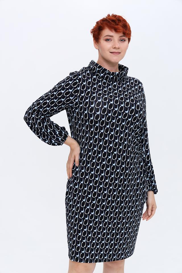 Модель имеет прямой силуэт, длину до колена и длинные рукава с небольшими сборками у манжет. Высокий воротник-стойка добавляет образу изысканности. Платье выполнено из качественной вискозы с добавлением эластана, что обеспечивает приятные тактильные ощущения и хорошую посадку по фигуре.