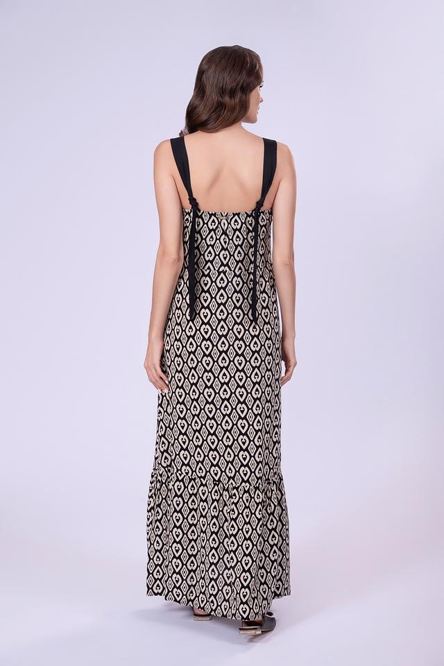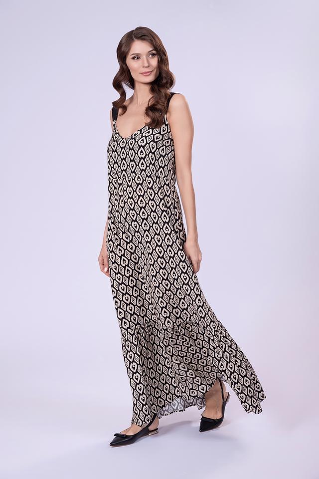 Основной цвет платья – чёрный, но оно украшено оригинальным геометрическим принтом в бежевых и чёрных тонах. Тонкие бретели регулируются с помощью завязок, что позволяет подобрать оптимальную длину. Вырез горловины квадратный.